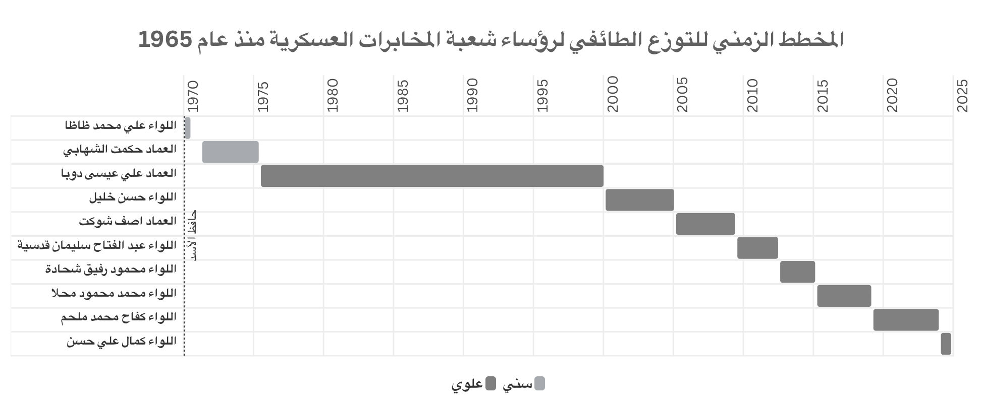 الشكل (2): المخطط الزمني للتوزع الطائفي لرؤساء فروع شعبة المخابرات العسكرية منذ عام 1965