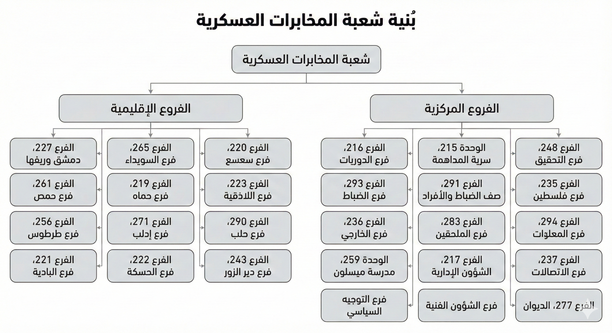 • ما البُنية التنظيمية لشعبة المخابرات العسكرية (الفروع المركزية، الفروع الإقليمية)، وما هي تبعياتها الإدارية وحدود اختصاصاتها وصلاحياتها.