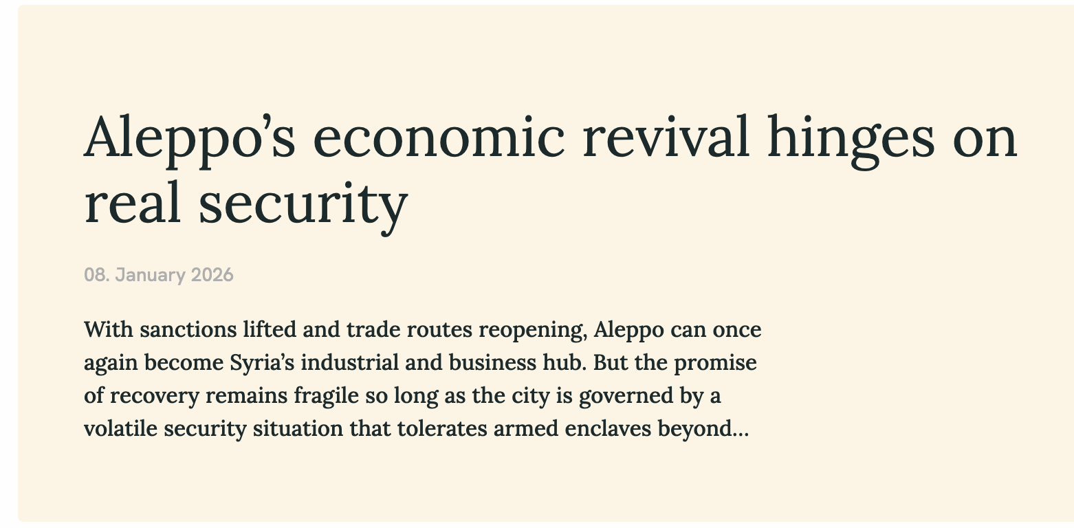 Economies fear more than anything unpriceable risk. When a city the size of Aleppo is exposed to security threats, investors are left asking: who guarantees our security? Who do we hold accountable if something goes wrong? Who can prevent the next escalation? This is why talk of lifted sanctions, reopened crossings, or transit agreements is only attractive headlines for now. These are tools for encouraging economic activity, not foundations. The foundational condition is the state’s monopoly over the legitimate use of force: within Aleppo, and in the country as a whole.