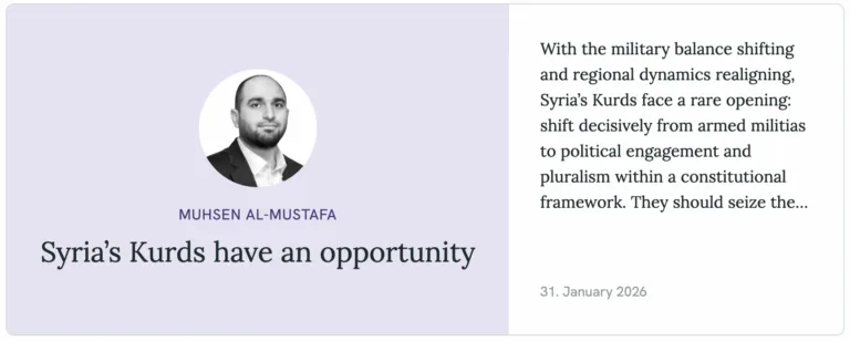 With the military balance shifting and regional dynamics realigning, Syria’s Kurds face a rare opening: shift decisively from armed militias to political engagement and pluralism within a constitutional framework. They should seize the opportunity or risk further reversals.