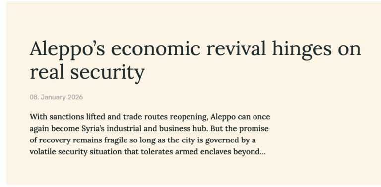 With sanctions lifted and trade routes reopening, Aleppo can once again become Syria’s industrial and business hub. But the promise of recovery remains fragile so long as the city is governed by a volatile security situation that tolerates armed enclaves beyond state control