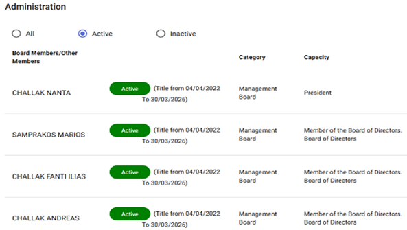 The company’s ownership has changed over time, but it has always included Andreas and Fanti Ilias Hallaq(7) More recently they have included their mother, Nanta, in the company. As of 28 August 2023, the listed administration on the company’spage at the Union of Hellenic Chambers of Commerce website (in Greek, English button available at the top right) are: