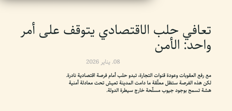 مع رفع العقوبات وعودة قنوات التجارة، تبدو حلب أمام فرصة اقتصادية نادرة. لكن هذه الفرصة ستظل معلّقة ما دامت المدينة تعيش تحت معادلة أمنية هشة تسمح بوجود جيوب مسلّحة خارج سيطرة الدولة.