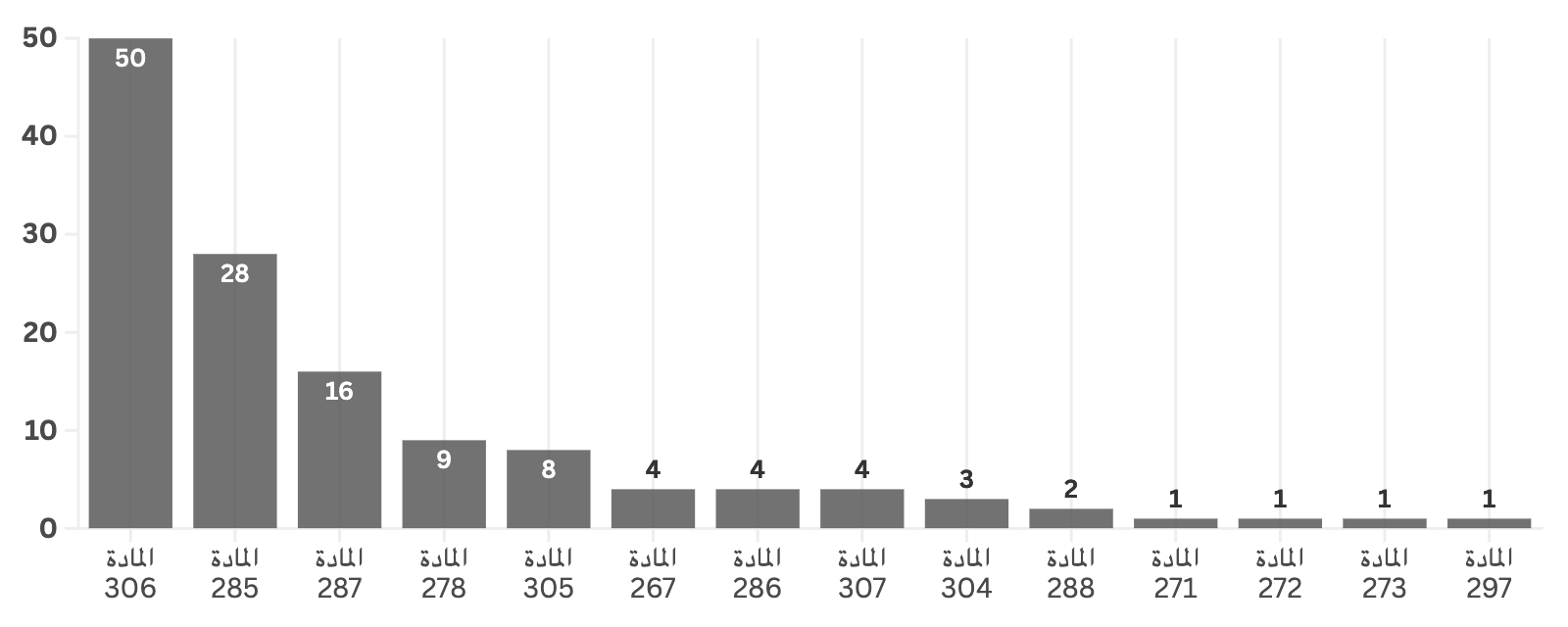 أما في المحاكم، فيتم استخدام نصوص قانون العقوبات العام، وقانون العقوبات العسكرية، وقانون الإرهاب بشكل تبادلي فيما بينها (لتتناسب كمرجعية قانونية مع التهم المُرفقة من الأجهزة الأمنية). وفي معظم الحالات، لا يمكن للمعتقل أن يعرف طبيعة التهم التي تم صياغتها من قبل المحقّق في ملف التحقيق النهائي، وبالتالي لا يعرف طبيعة المواد القانونية التي يحاكم بناءً عليها، خصوصاً في الإحالة إلى محكمة الميدان العسكرية، وبشكل أقل في محكمة الإرهاب، يليه القضاء العسكري، وهكذا. وبحسب تقرير “الاحتجاز في صيدنايا” فمن أصل 400 عينة، تم تحديد 132 حالة أشار بها المعتقل لمادة قانونية معينة تمت محاكمته على أساسها. وفي الغالب فإن هذه المواد كانت تلك المرتبطة بالجرائم الواقعة على “أمن الدولة والسلامة العامة” (من المادة 260 حتى 339) الواردة في قانون العقوبات العام(58).