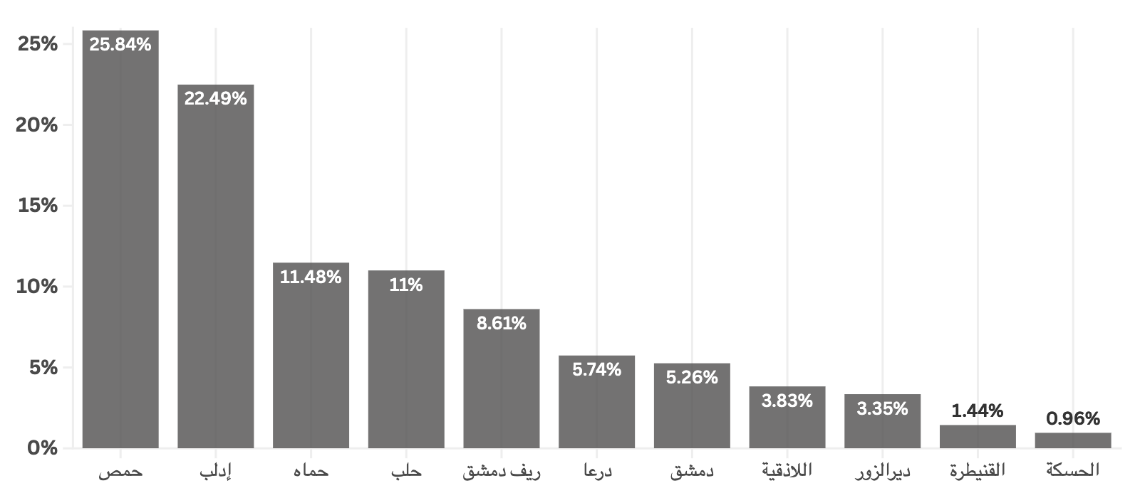 كانت هذه التصورات، المبنية على المزاج الشخصي للمحقق أو على توجهات مؤسسية أمنية، تؤثّر بشكل مباشر في توصيات الإحالة، إذ غالباً ما تُوجّه ملفات المعتقلين المنحدرين من مناطق بعينها إلى المسارات التي تفضي في نهايتها لسجن صيدنايا العسكري. وهكذا، أصبح الانتماء الجغرافي معياراً ضمنياً موازياً للاتهام، يعكس كيف تماهى النظام الأمني والقضائي مع منطق الانتقام لا العدالة، ومع العقاب السياسي لا المحاسبة القانونية. وهذا ما يؤكده تقرير “الاحتجاز في صيدنايا”، حيث توزَّعت نسب المعتقلين على المحافظات بعد عام 2011، بحسب الشكل التالي: